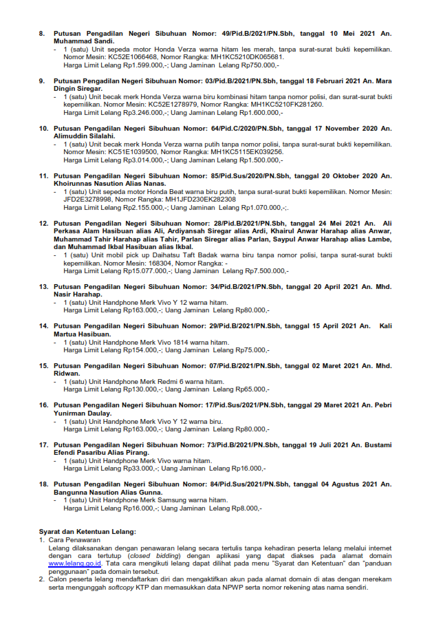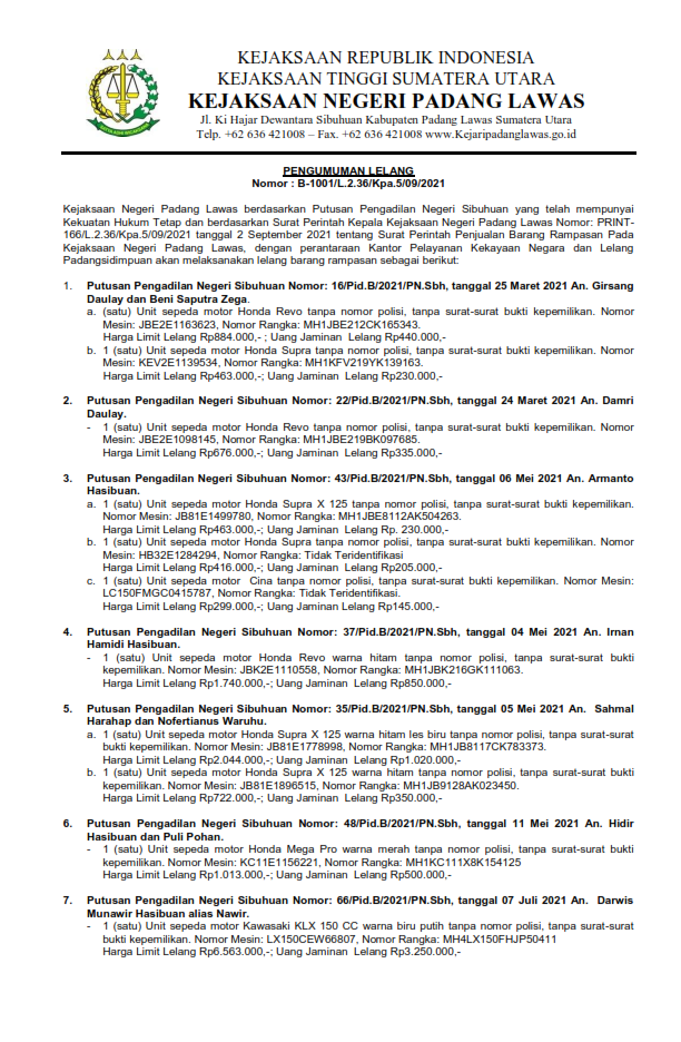 Kejaksaan Negeri Padang Lawas melalui KPKNL Padang Sidempuan akan melaksanakan lelang barang rampasan pada hari Senin, 11 Oktober 2021. Bagi yang ingin mengikuti lelang, pastikan telah memiliki akun e-auction pada situs web www.lelang.go.id.