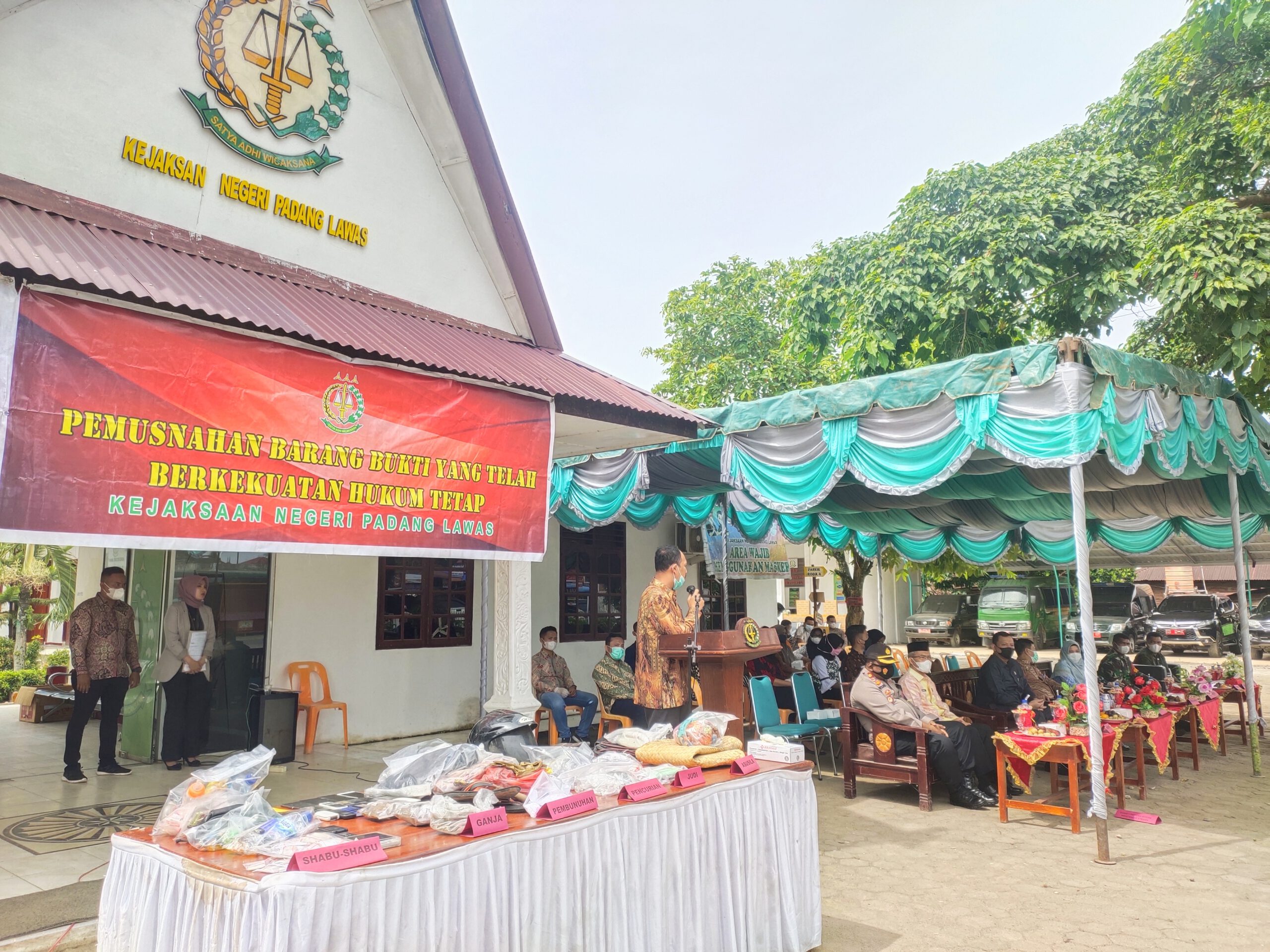 Kepala Kejaksaan Negeri Padang Lawas, Teuku Herizal, S.H., M.H. dalam sambutannya menyampaikan bahwa pemusnahan tersebut merupakan kegiatan rutin Kejaksaan Negeri Padang Lawas yang merupakan tindak lanjut dari tugas Jaksa untuk mengeksekusi barang bukti perkara yang telah memperoleh kekuatan hukum tetap sebagai akhir dari proses perkara tindak pidana tersebut. Adapun barang bukti yang dimusnahkan berasal dari 66 perkara tindak pidana umum yang terdiri dari 19 kasus Oharda (Orang dan Harta Benda), 4 kasus Kamtibum (Keamanan dan Ketertiban Umum), dan 43 kasus TPUL (Tindak Pidana Umum Lainnya).